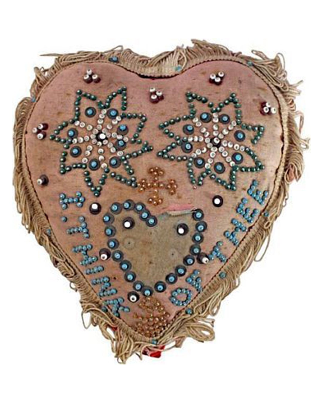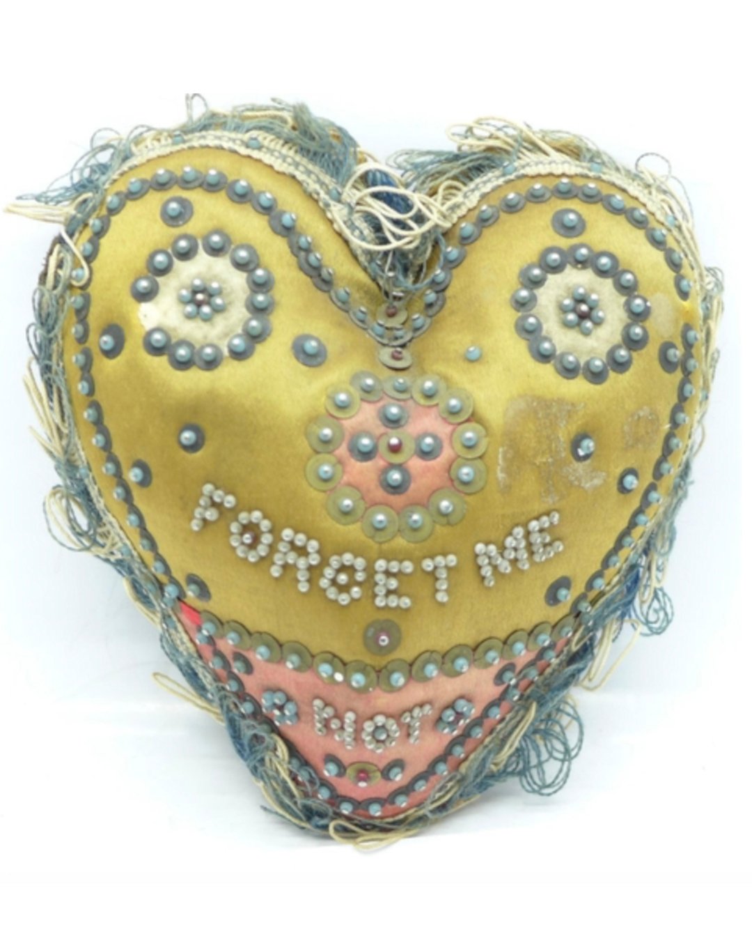 Sweetheart pincushions were made by soldiers during the first world war for loved ones back home. They are a token of love for the people who mean most to us, shown through needle and thread. Nurses provided material kits whilst looking after the injured. The pincushions were often made from ciggarette cards, beads, lace and trimmings with messages such as ‘I think of thee’ and ‘Forget me not’.